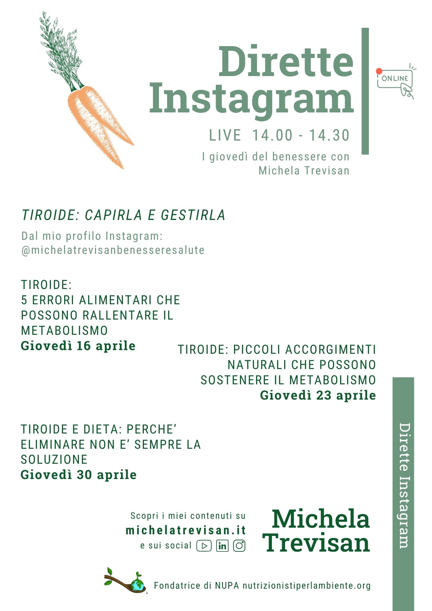 Ad aprile terrò tre dirette Instagram di giovedì: 16-23-30 aprile dalle 14.00 alle 14.30 nel mio canale Instagram @michelatrevisanbenesseresalute.